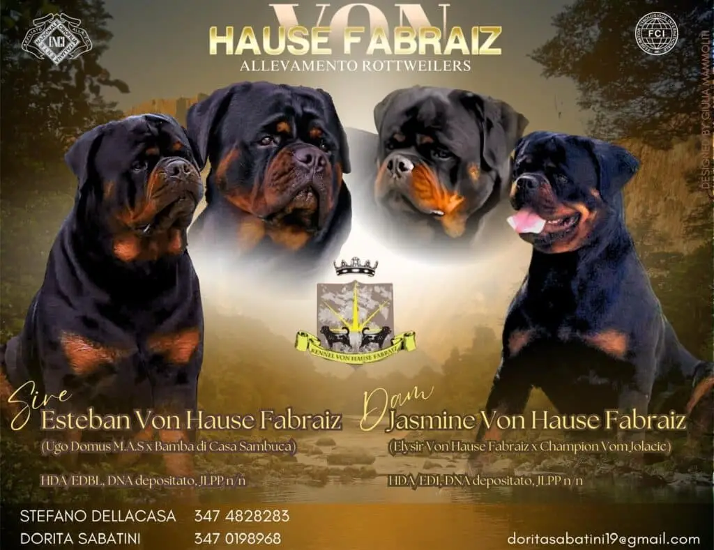 Il nostro allevamento si distingue per accoppiamenti di Rottweiler di elevata genealogia, scegliendo come genitori esemplari della rinomata linea Von Hause Fabraiz. Questa linea è riconosciuta per la sua eccellenza genetica, equilibrio caratteriale e caratteristiche morfologiche distintive, garantendo così cuccioli di altissima qualità.